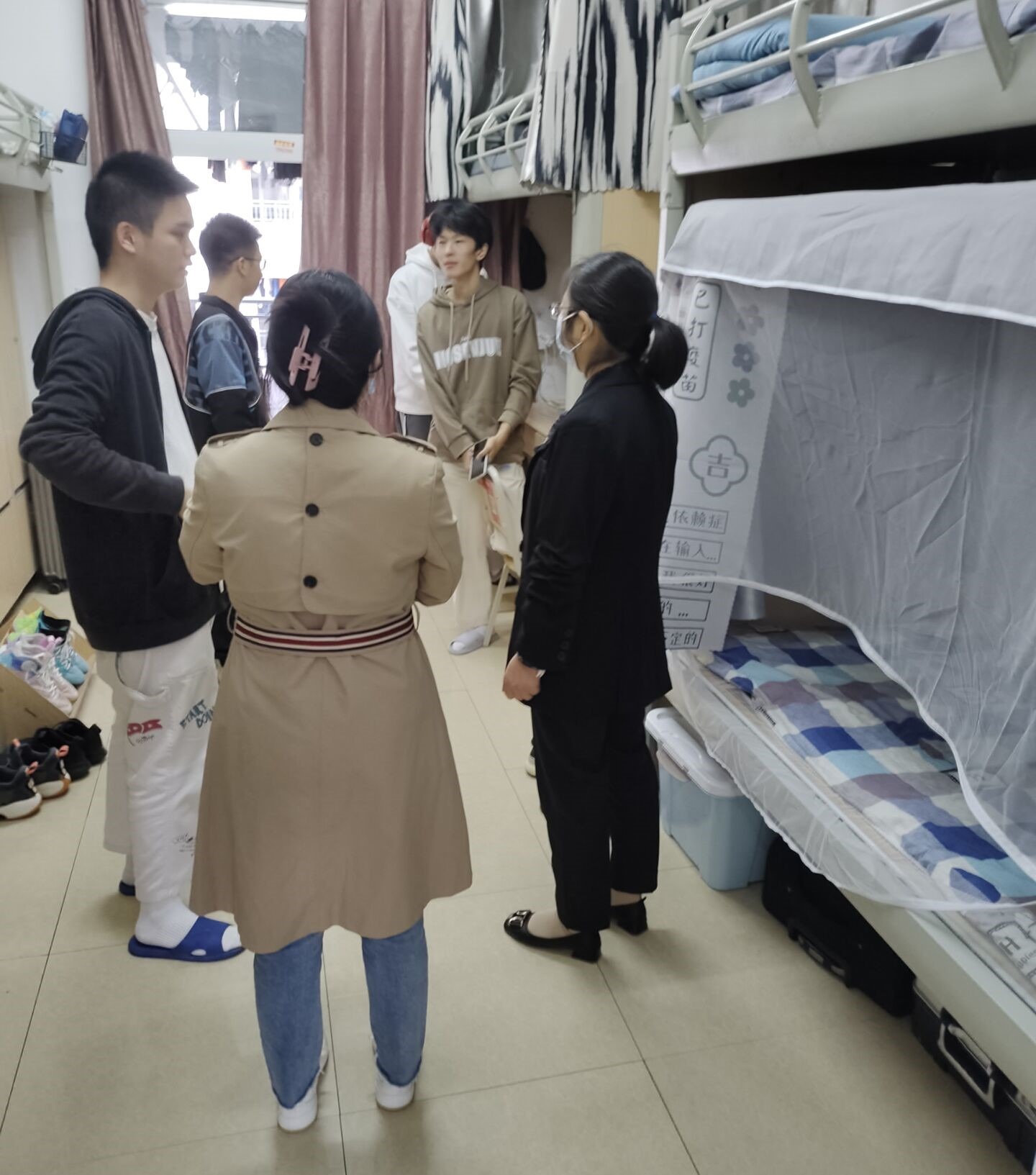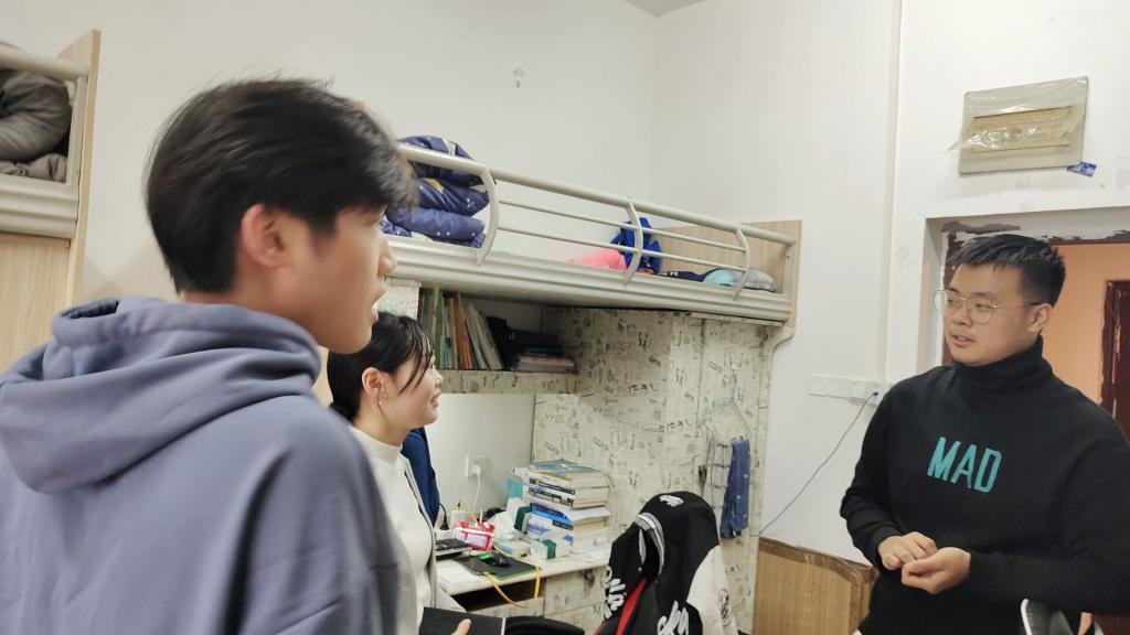 检查过程中,黎涵副书记与2022级新生进行新切交流,了解近期在校学习、生活情况,并为同学们讲解老员工活,希望他们尽早适应新环境,最后提醒同学们有困难要及时与辅导员老师以寻求帮助。