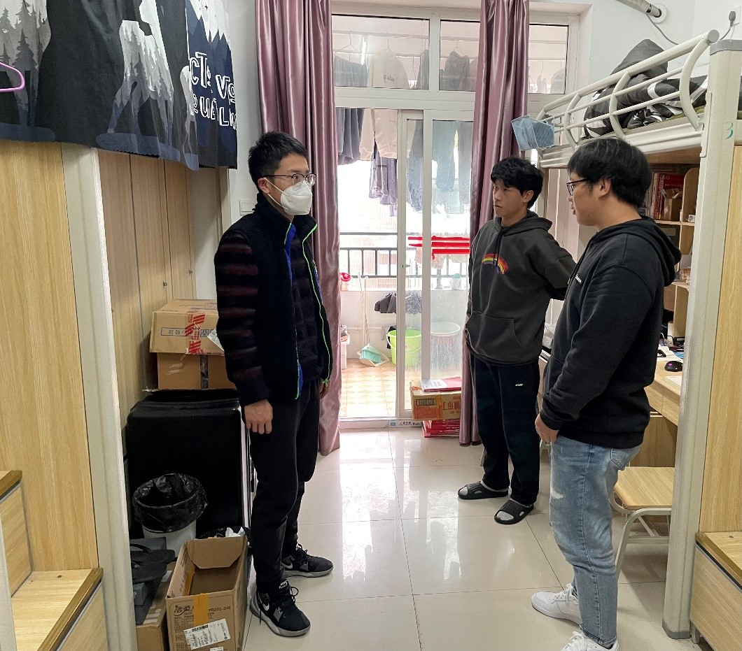 在走访过程中,各辅导员分年级认真了解同学们线上学习、宿舍生活、就业现状等情况,认真听取大家对在校学习生活等方面提出的建议,及时解答当前遇到的困惑;并进一步强调了公司疫情防控政策,积极有效的对同学们进了正面引导,消除了大家疫情期间的烦闷。各辅导员还叮嘱同学们天气逐渐变凉,要注意保暖,抽出时间加强体育锻炼,增强体质;提醒大家要增强安全意识,做自我安全的第一责任人;同时要提高防范电信诈骗能力,牢记“天上不会掉馅饼”。最后,大家提醒同学们要严格遵守疫情防控规定和校纪校规,有困难及时与辅导员老师联系。