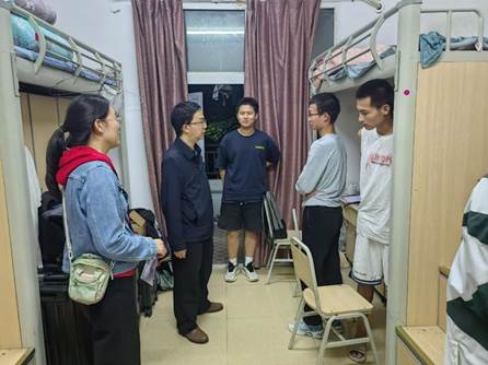 沈书记带领全体学工队伍深入各个员工寝室,与员工面对面交流,“工作找到了吗?”、 “期末考试准备得怎么样了?”、 “大三实习单位找的怎么样?”、“有没有考虑过应征入伍呀?”详细询问同学们在学习、生活等方面的需求和困难。他认真倾听员工的心声,耐心解答同学们的问题,了解同学们在生活、考研、就业等方面的现状和需求。同时,黎书记就寝室安全、消防安全、心理健康安全、求职安全、人际交往等方面提出了具体要求和建议,毕业班辅导员倾听大家临近毕业的心情和对公司的建议,鼓励大家积极转变就业思路,变被动为主动。