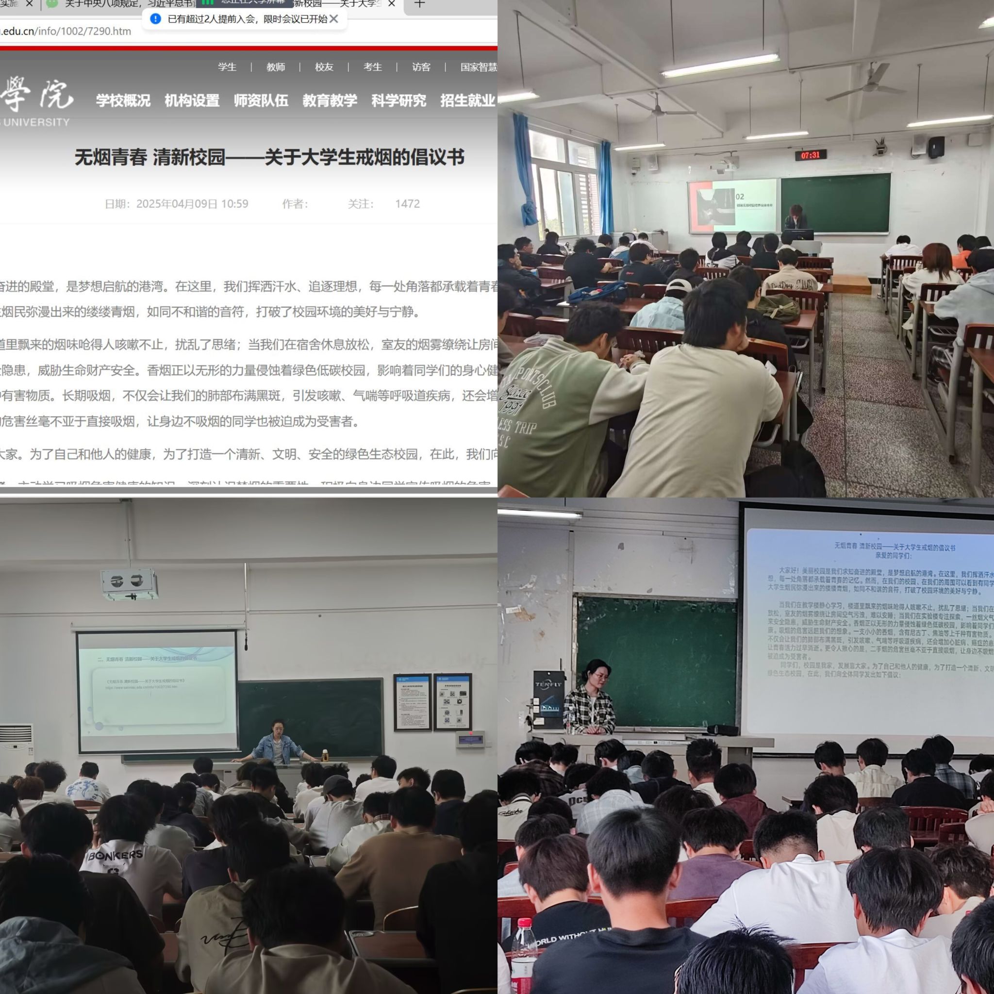 在学习过程中,各辅导员详细解读了倡议书的各项要点,通过展示吸烟危害健康的数据、因吸烟引发疾病的典型案例,让员工们直观地感受到吸烟对个人、他人及校园环境的负面影响,各年级员工积极响应,认真聆听;同学们也纷纷表示,将以实际行动践行无烟理念,带动身边同学共同为打造清新校园贡献青春力量。