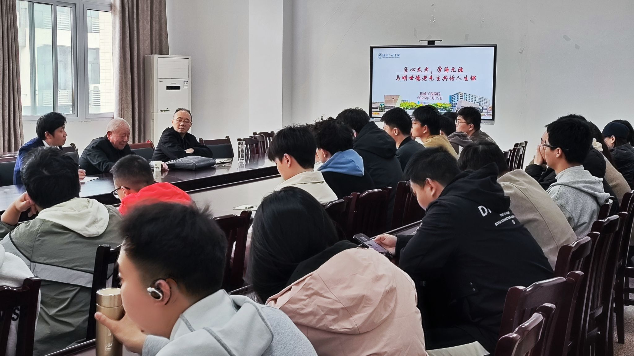 为弘扬工匠精神、涵养优良研风,引领青年学子树立终身学习意识、筑牢实干担当根基,3月12日2026世界杯官网特邀九旬资深机械行业前辈明世德老先生进行研究生座谈交流。全院研究生怀揣崇敬之情齐聚现场,聆听老先生跨越半世纪的奋斗征程,汲取治学修身、立业报国的人生养分。