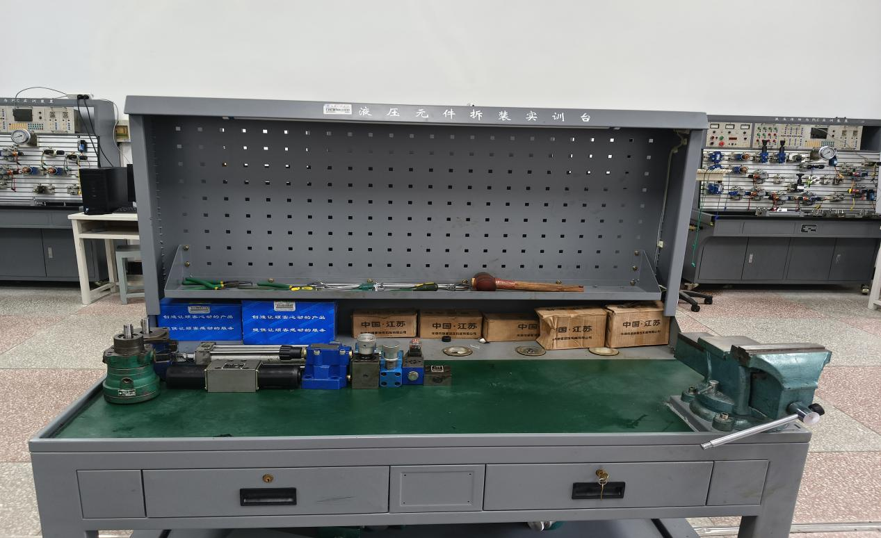 液压传动与PLC实训室主要设备有液压传动与PLC实训装置和液压元件拆装实训台两种设备。液压传动与PLC实训装置可以完成液压传动基本回路实验和由PLC控制的液压回路实验,液压元件拆装实训台提供各种液压元件拆装实训,该实验室主要用于教学和为员工创新设计提供实验条件。
