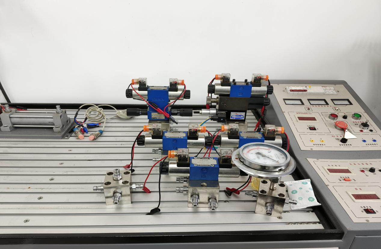 液压系统创新应用实训室主要设备有液压传动系统创新应用实训装置,能够完成液压阀基本调试控制实训、继电器应用控制实训和PLC综合控制实训,通过员工自行设计液压回路和电气控制回路,培养员工独立思考能力、创新能力和动手能力。